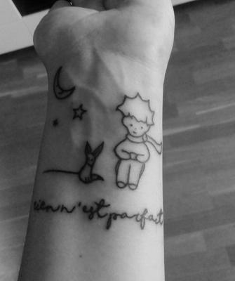 O svém prvním tetování jsem měla jasno už od svých patnácti let. Malý princ a liška. Moje dvě nejmilovanější literární postavy. Pod nimi nápis: Rien n’est parfait. Což francouzsky znamená: Nic není perfektní. Byla jsem z těch pár čar tak nadšená, že to ani slovy nejde vyjádřit. A zase jsme u toho, emoce, které nejdou popsat slovy, vyjádří obraz.