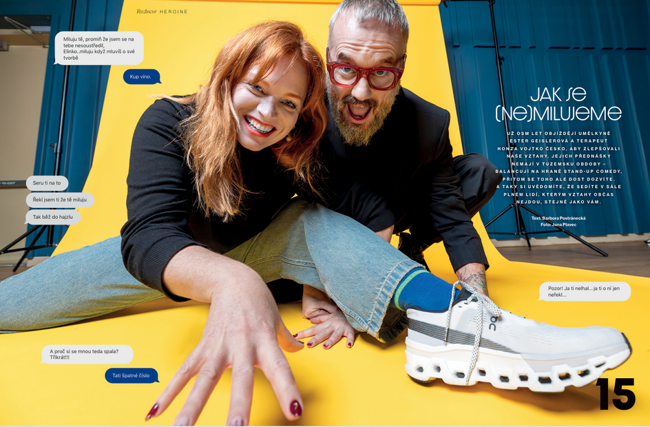 Z horní poloviny obálky, která představuje dvouhlavou kartu, shlíží umělkyně Ester Geislerová, zespodu hledí psychoterapeut Honza Vojtko. Dvojice, kterou před lety svedly dohromady rozchodové smsky, dnes objíždí Českou republiku a v narvaných kulturácích vysvětluje, o čem jsou vztahy, rozchody, emoce… Na jednu takovou show jsme se vydali a Barbora Postránecká pak Ester a Honzu vyzpovídala.