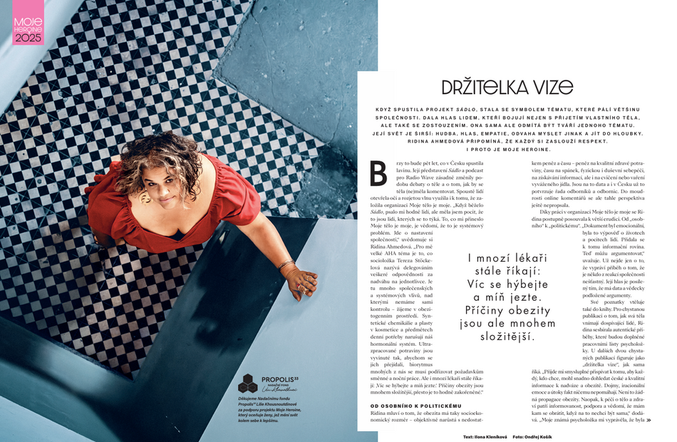 Často v Heroine píšeme o tom, že silné příběhy a jejich aktérky a aktéři mají moc zatřást se zabetonovanými strukturami společnosti. A takových lidí v tomto čísle představujeme ještě víc: Ridina Ahmedová svým divadelním představením Sádlo a stejnojmenným podcastem odkryla, jak odsuzujeme lidi, kteří žijí s nadváhou, a ukázala, jak se tito lidé cítí a proč je to s tloušťkou mnohem komplikovanější, než se na první pohled může zdát. Ridinu oceňujeme jako Moji Heroine, protože její působení ve veřejném prostoru dává věci do pohybu tím správným směrem.