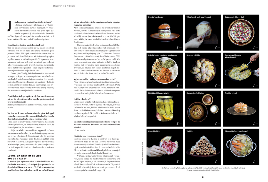 Vezmu to pěkně od začátku: na obálce je vyfocená Kristína Nemčková. Nejmladší vítězka soutěže Masterchef vystudovala prestižní kulinární akademii Le Cordon Bleu a pak začala vařit v michelinských restauracích. Vyzkoušela si, jaké to je pracovat v nejlepší restauraci na světě, pak se odstěhovala do Japonska a teď rozjíždí nový podnik v Manile. V Česku byla nakrátko, ale zvládli jsme zorganizovat focení i rozhovor – a to zejména díky pomoci její maminky, Evy Nemčkové – Mojí Heroine z roku 2022. Přečtete si rozhovor o tom, jak to chodí v nejlepších kuchyních světa!