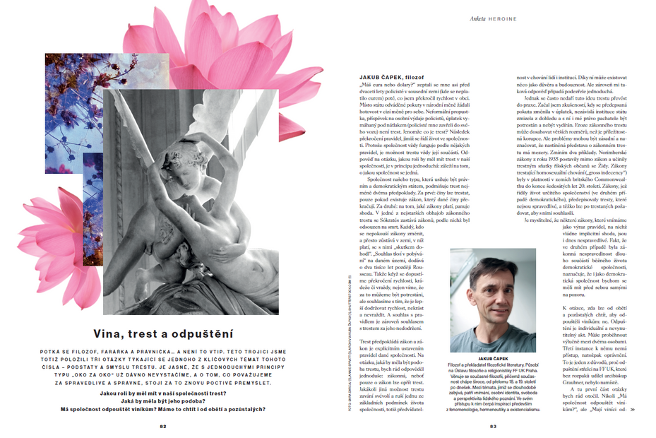 Na konferenci vystoupí islandská autorka Thordis Elva, jejíž kniha South of Forgiveness vyjde v češtině pod názvem Chci se ti podívat do očí v Edici Heroine už během října. Ukázkou z knihy naše nové číslo začíná, a jelikož se jedná o text, který popisuje setkání oběti znásilnění s pachatelem a hledání odpuštění, rozhodli jsme se věnovat část aktuálního vydání restorativní justici. Požádali jsme filozofa, farářku a právničku, aby se zamysleli nad smyslem trestu v naší společnosti a také nad tím, zda a do jaké míry lze odpustit viníkům. Jejich zamyšlení čtěte od str. 82.