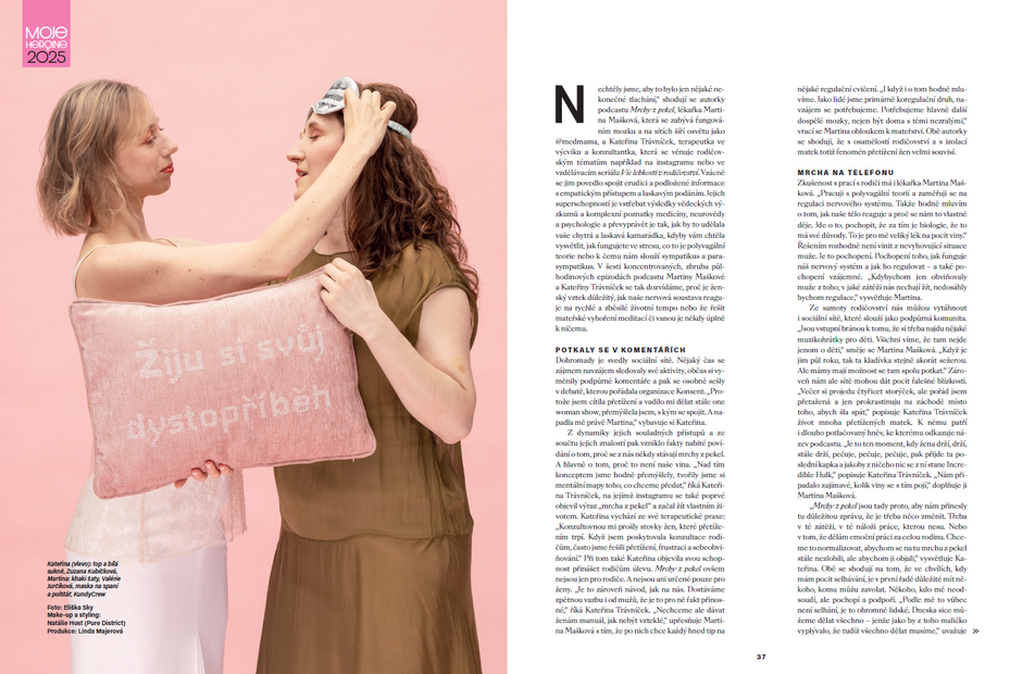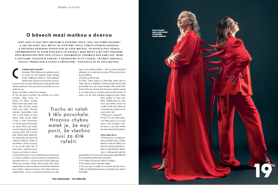 Na obálce je herečka a zpěvačka Berenika Kohoutová se svou mámou, spisovatelkou Irenou Obermannovou. Při čtení rozhovoru, který s nimi vedl Lukáš Houdek, budete mít pocit, jako byste taky seděli u Bereniky v kuchyni. Otevřenost jejich dialogu (nebo spíš permanentních, byť láskyplných hádek) je skvělá a inspirativní, dotýkají se totiž spousty témat, o kterých se jiní zatím báli mluvit.