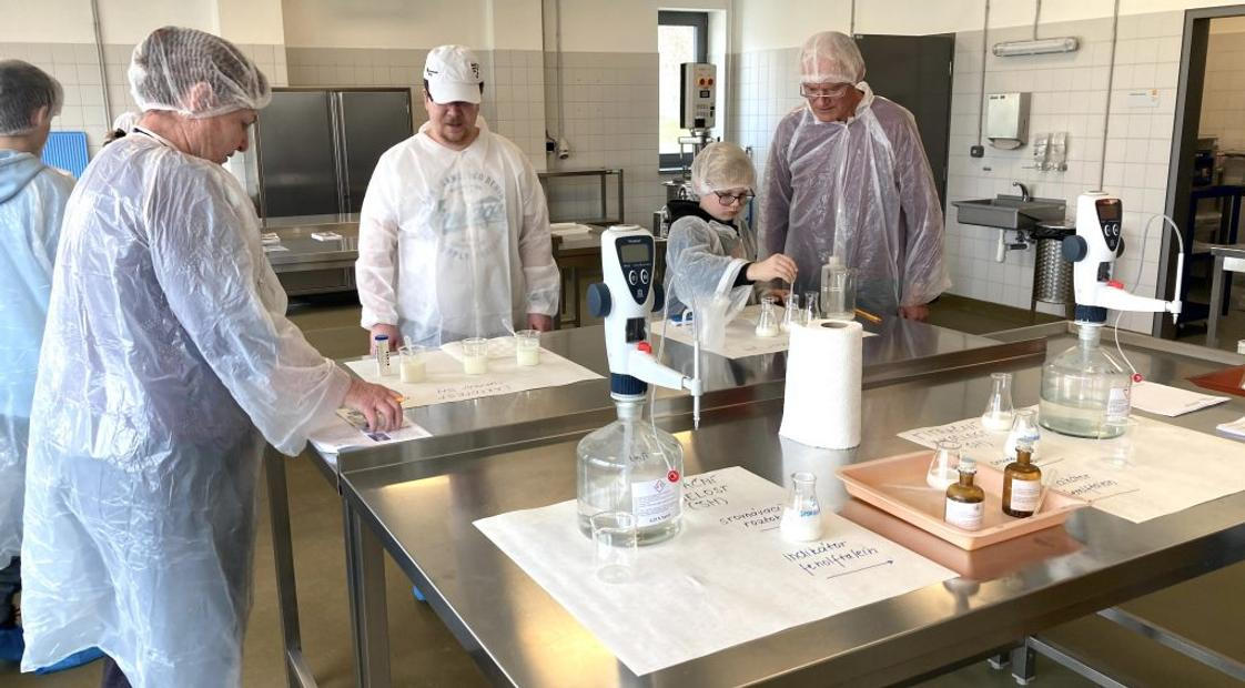 „Tak se přesuneme dál na kontrolu mléka,“ navrhuje koordinátorka Kamanová, která mě tady mezi jednotlivými stanovišti provází. V další laboratoři tři páry účastníků měří kyselost kefíru, acidofilního mléka a čerstvého mléka. A to pomocí takzvané titrace. Sleduji, jak se děti spolu s prarodiči snaží určit pH u tří tekutin. Kromě toho tady taky zjistí, co všechno musí být na obalu mléka zmíněno a jak se pozná jeho kvalita.