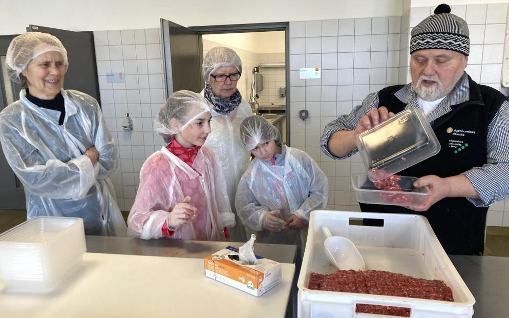 Ten dnešní program se odehrává v poloprovozech Agronomické fakulty. Tady běžně studenti a výzkumníci zpracovávají a testují například maso, mléčné výrobky nebo vajíčka. Tyto tři základní potraviny dnes budou zkoumat i účastníci Mezigenerační univerzity. Aktivity dělají buď ve dvojici, nebo každý sám. Všechno spolu ale sdílí.