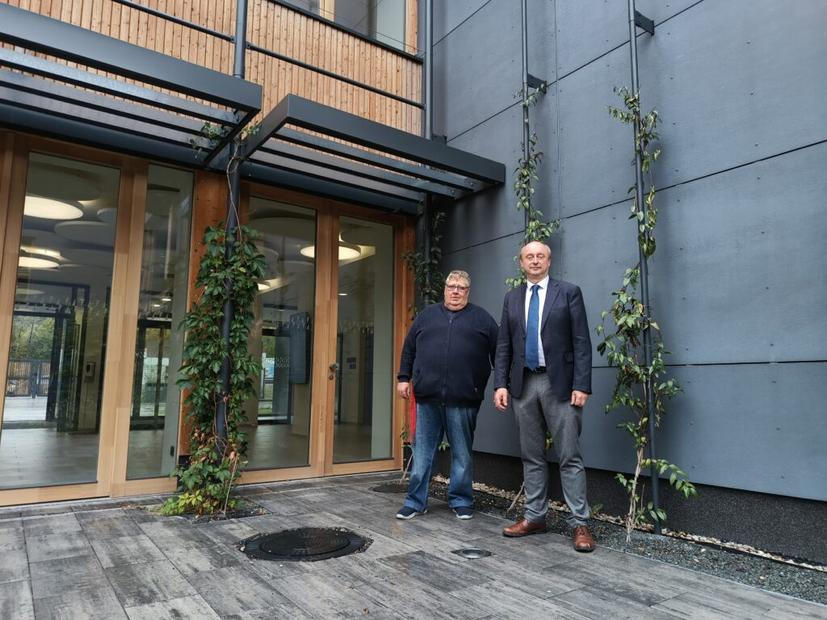 Objekt připomíná hranaté písmeno U, na centrální ploše mezi křídly školy jsou před bufetem venku rozmístěny bílé stolečky a židle, aktuálně prázdné, protože prší. Nechybí posezení u stromů. Až do této chvíle by se mohlo zdát, že jde prostě o pěkně zpracovaný, moderní projekt. Tento dojem ale rychle pomine ve chvíli, kdy se rozpovídáme se správcem o tom, co vše objekt školy „umí“.