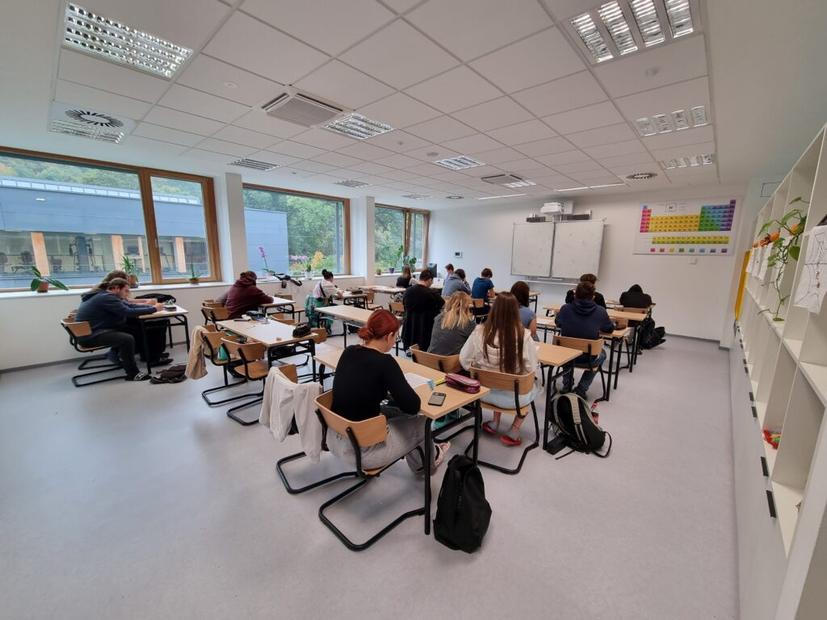 Spolu s Pavlem Malým také zdůrazňují, že škola funguje v rekuperačním režimu, nemusí se tak větrat. Ve chvíli, kdy vcházíme do učebny, je v ní přitom čerstvý vzduch. „Systém ve třídách před vyučováním vymění vzduch a nastaví klimatizaci. Spolupracuje s programem Bakaláři, ve kterém je uložený rozvrh i počty studentů v jednotlivých třídách,“ vysvětluje Ležal. Zároveň ukazuje, jak fungují zatemňovací rolety.