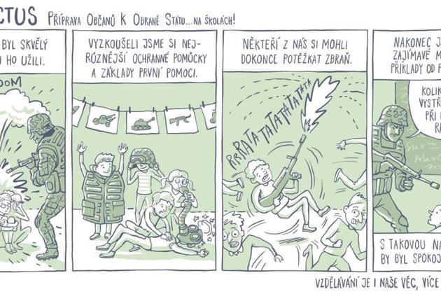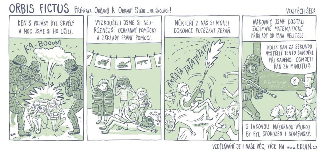 Nový díl komiksu Orbis Fictus, který EDUin připravuje ve spolupráci s kreslířem Vojtěchem Šedou, upozorňuje na problematické pojetí branné výchovy, které školám nabízí Ministerstvo obrany v rámci projektu POKOS. Již dříve jsme k tématu publikovali stanovisko SKAV a komentář Boba Kartouse. Ve větším rozlišení si tento díl komiksu můžete stáhnout ZDE.