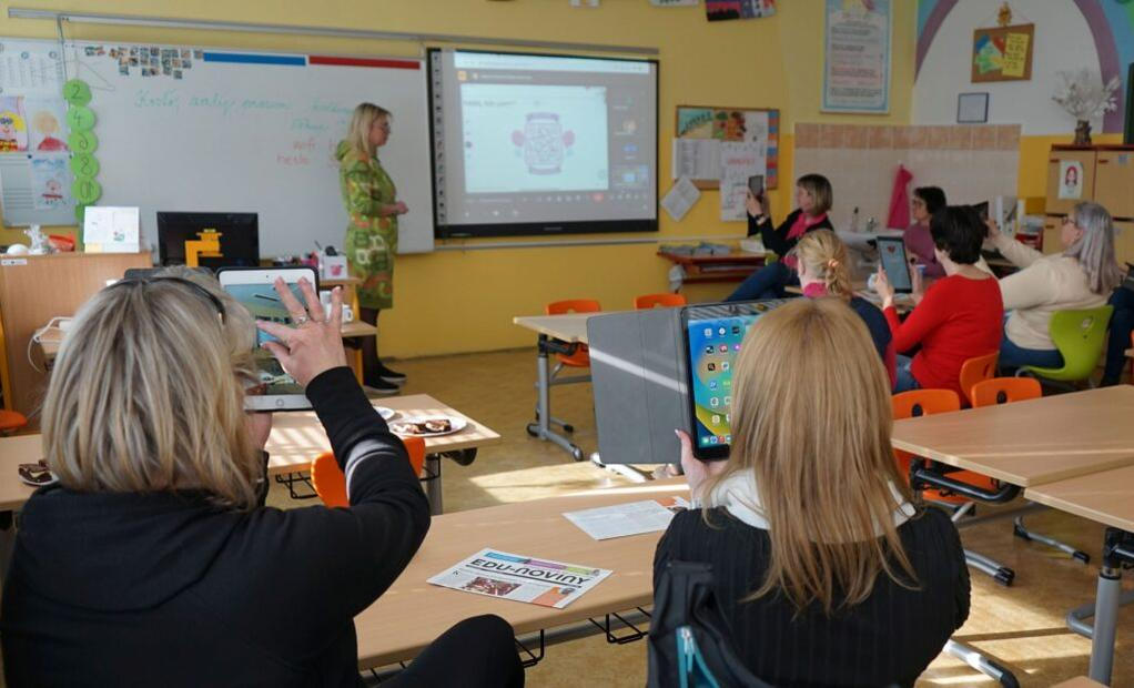 V hybridní učebně základní školy ve Zruči nad Sázavou sedí u iPadů třináct učitelek a učitelů a dalších dvanáct je připojených na Google Meet. Na lavicích se kouří z hrnků s kávou a svítí z nich zapnuté obrazovky tabletů, v jejichž využívání ve výuce patří škola k průkopníkům v regionu.