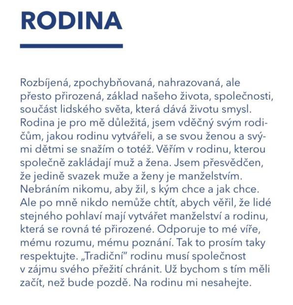 Po internetu se šíří vyjádření profesora Petra Fialy o rodině. Předseda ODS a největší strany koalice SPOLU do nadcházejících voleb do Poslanecké sněmovny v něm mj. píše o „přirozené“ rodině tvořené mužem, ženou a dětmi jako protikladu k soužití homosexuálního páru (s případnými dětmi); rozbíjení a zpochybňování té „tradiční“ rodiny a nutnosti ji chránit, „než bude pozdě“. Jeho výroky vyvolaly na sítích bouřlivé reakce. Business as usual: další den, další twitterová přestřelka a další „kulturní válka“ v českém rybníčku.