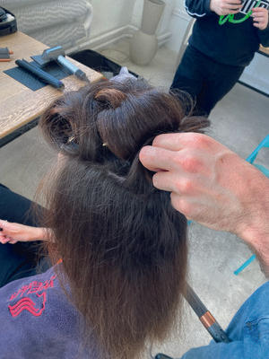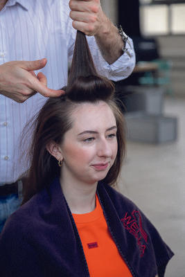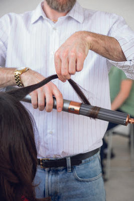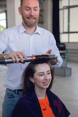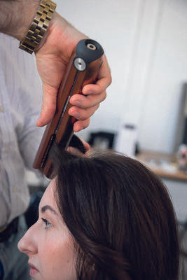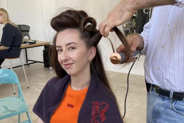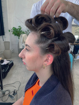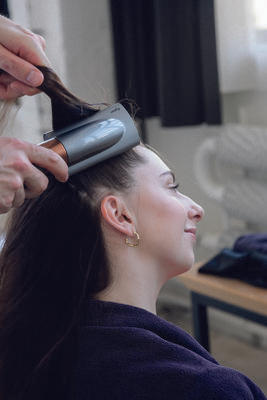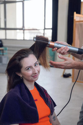 Vlasy fénem nebo Airwrapem předvysušte a rozdělte na tři rovnoměrné sekce, aby se vám potom s jednotlivými prameny lépe pracovalo. „Teď vezměte fén Dyson Supersonic a kulatý kartáč. Na něj namotejte jednotlivé prameny, zafixujte studeným vzduchem a připněte pinetkou k hlavě. Je to ten nejspolehlivější způsob, jak účesu dodat dlouhotrvající objem,“ připomíná Martin Tyl.