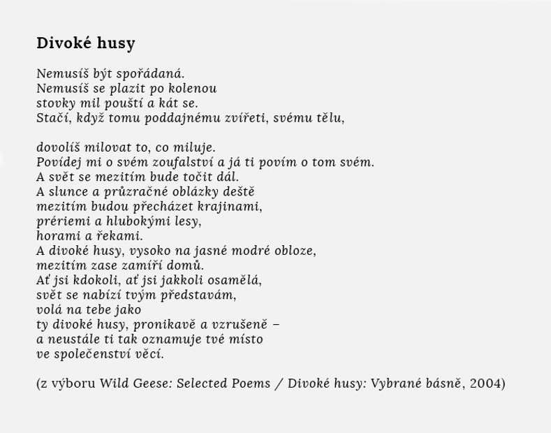 (Překlady básní „Znám někoho“ a „Divoké husy“ pořídila Sylva Ficová pro časopis Tvar, kde také vyšly roku 2017. Ostatní překlady vybrala ze svého „šuplíku“.) Fotografie (c) Mariana Cook pro Penguin Press.