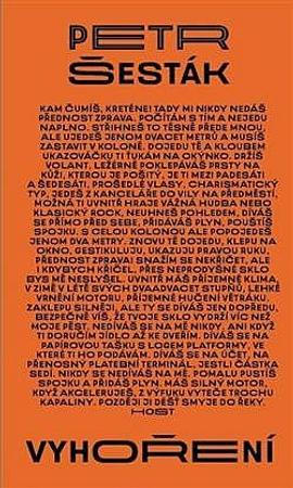 Útlou záležitostí z Hostu je i Vyhoření Petra Šestáka. Jen tematicky se dostáváme úplně jinam – hlavním hrdinou je zde kurýr rozvážející po městě jídlo pro jednu z nejmenovaných rozvážkových platforem. A hlavním antihrdinou je auto. Vlastně hodně aut. Dílo na hranici žánrů pamflet – román – alegorie ale zdaleka není jenom hejtem na automobily nebo ekologickým manifestem, jak by se na první pohled možná mohlo zdát. Je především zběsilou jízdou (která se ostatně propisuje i do tempa a jazyka knihy) člověka moderní dobou, která je plná extrémů i vzájemného nepochopení. A také neschopnosti být k sobě prostě laskaví.