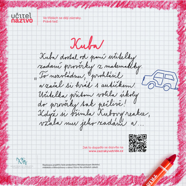 Díky odezvě kampaně vím, že jsme se nespletli. Stejně jako já v době „před Učitelem naživo” i velká část veřejnosti žije ve stereotypních představách o tom, jak vypadá práce učitelů. Často jsou formované i negativními zážitky. Naše zázračné příběhy ale vedou lidi k tomu, aby si uvědomovali, že realita není černobílá a že školství je o lidech. Čím více se budeme jako společnost zabývat kvalitou školství a čím víc budeme investovat do lidí, kteří ho tvoří, tím méně budou potřeba podobné projekty. Každému totiž bude jasné, že učitelé dokážou zázraky. V týmu Učitele naživo máme velkou radost z toho, že se kampaň setkává s pozitivním ohlasem.