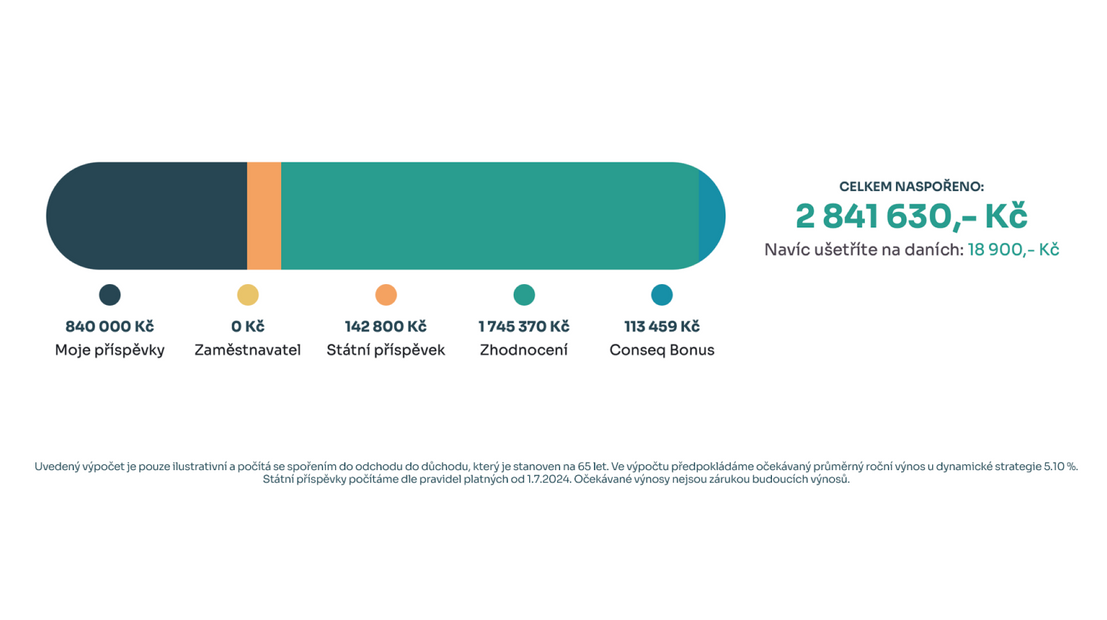 Na příkladu výše vidíte, kolik by si vaše dítě přibližně naspořilo na důchod, pokud by si začalo odkládat 2000 Kč ve 30 letech do dynamické strategie. I tady hraje roli efekt složeného úročení a do důchodu by odešlo s cca 2,8 miliony korun, z čehož by státní příspěvky tvořily 142 800 Kč, předpokládané zhodnocení přes 1,7 milionu korun a navíc by ještě získalo bonus za věrnost od ZaVodou, a to více než 113 tisíc korun. Pokud předpokládáme, že v důchodu bude cca 20 let, měsíčně by si tak přilepšilo přibližně o 11 840 Kč.
