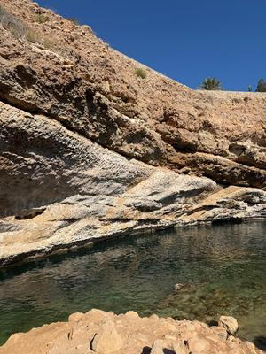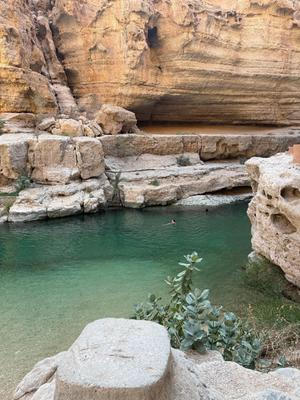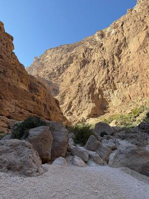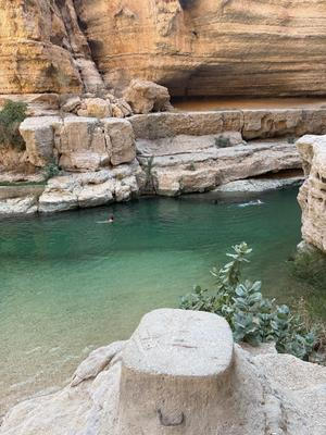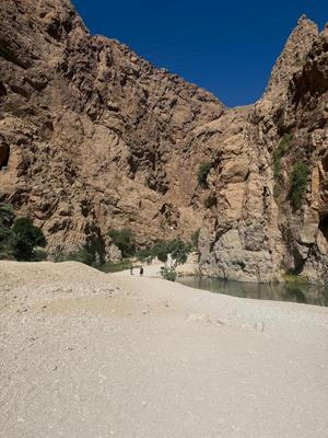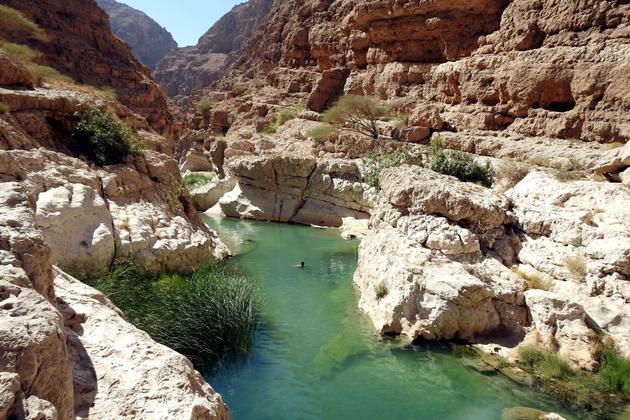 Vádí je označení pro pouštní údolí, kterým protéká řeka. V Ománu je takových vádí mnoho, jedno z nejpopulárnějších se jmenuje Vádí Šáb a nachází se asi hodinu a čtyřicet minut od metropole Maskatu. Autobus necháme na parkovišti pod dálničním mostem a lodí se přeplavíme na druhý břeh řeky. Pak už se vydáme po svých. Koupání si budeme muset zasloužit.