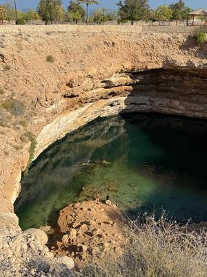 Místní říkají, že jde o kráter způsobený pádem meteoritu… Ve skutečnosti je Bimmah Sinkhole vodou naplněná prohlubeň (propadlina) ve vápenci, takový přírodní bázen, chcete-li. Představte si koupání v lomu, jen s tím rozdílem, že sladká voda se tu promíchává se slanou. A je tu ještě jeden, dost zásadní rozdíl - ta voda je průzračná, modro-zelená.