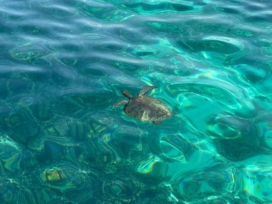 Jsme ještě celkem blízko mělčiny, když zahlédneme želvu zelenou. Kdybych natáhla ruku, mohla bych se jí dotknout. Plavu chvíli nad ní, chvíli vedle ní, opatrně, abych ji nevyplašila, ale nevypadá, že by z nás měla strach. Když se v jednu chvíli nečekaně vynoří na hladině a pohlédne do tváře mé kolegyně, hádejte kdo se lekl více…