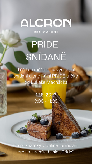 Speciální snídani za 1 450 Kč si můžete zarezervovat zde: https://www.alcronprague.cz/rezervace/. Do poznámky v online formuláři prosím uveďte heslo Pride.