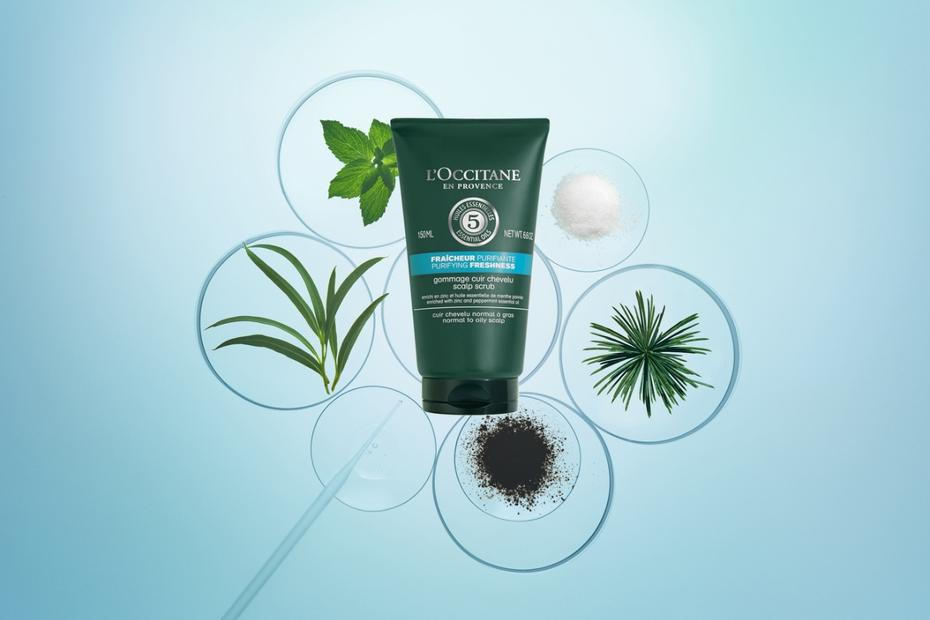 Tento produkt formulovaný bez silikonu a s koktejlem 5 esenciálních olejů (tymián, grapefruit, máta, levandule, cedr) má příjemnou texturu včetně exfoliační mořské soli, která působí na odstranění zbytků, nečistot a odumřelých buněk, které zmatňují vlasy. Pokožka hlavy je po použití čistá, svěží a připravená na zbytek rutiny. Produkt pokožku i vlasy čistí hloubkově, takže vlasy jsou po použití déle lesklé a čisté. Scrub i redukuje přebytek kožního mazu, který způsobuje nepříjemný zápach. Vůně na vlasech vydrží až 24 hodin. Produkt obsahuje mátu z Provence, černé uhlí a zinek. Je formulován bez silikonů a sulfátů. Jeho složení je veganské. Je vhodný pro normální až mastné vlasy.
