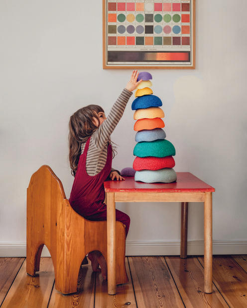 „Jeee, mami, co to je?“ Ptá se čtyřletá dcera s nadšeným údivem, když rozbaluji duhový set šesti kamenů Stapelstein a confetti balanční desku. „To jsou balanční kameny a deska. Můžeš na nich zkoušet, jestli udržíš rovnováhu, přeskakovat z jednoho na druhý, postavit z nich věž nebo cokoliv jiného, co tě napadne,“ vysvětluji dceři a přemýšlím, co dalšího by s nimi mohla dělat. Jak se vzápětí ukáže, nebude to vůbec potřeba. Než odnesu obaly do koše, už v jednom z kamenů sedí, houpe se ze strany na stranu a sama uvažuje, co by s nimi tak ještě vyvedla.