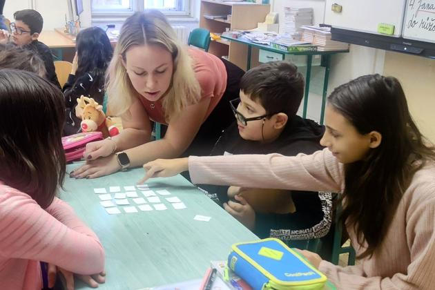 Nakonec ale přece jen musí strávit víc času u „svých“ žáků, a to v momentě, kdy se třída dělí do čtveřic a mají hrát pexeso. Hledají dvojice složené ze slova lichotivého a hanlivého. Je vidět, že hlavně na Aničku je to hodně úkolů najednou. Musí si zapamatovat umístění karet a k tomu ještě z hlavy vylovit patřičnou dvojici. Pořád se plete a už otočené karty pokládá jinam, než odkud je vzala. Aneta u čtveřice stojí a trpělivě pomáhá. „Co jsou to pačesy?“ ptá se Dan. „Co je to chatrč?“ neví Anička. „Kdybych u nich nestála, ani by nedokázali začít hrát,“ říká o přestávce Aneta. „Dohadovali by se o pravidlech a o tom, kdo bude hrát první. Anička by nejspíš jen tak obracela kartičky.“ Zatímco se Aneta věnuje čtveřici u dveří, učitelka Kateřina stíhá řešit zádrhele, se kterými bojují ostatní skupiny. Mimochodem jako první zvládne všechny dvojice odhalit čistě ukrajinská parta kolem Maxe a Tolji, kteří to patřičně oslaví jásáním a tleskáním. Zvoní.