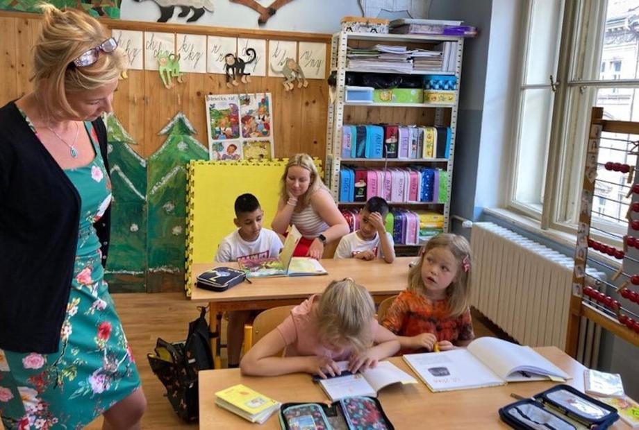 U čtvrťáků se už hodina češtiny rozjela. Z šestnácti dnes přítomných dětí podle jmenného seznamu na zdi nejméně polovina pochází ze zemí bývalého Sovětského svazu. Některé se v Česku už narodily, jiné přišly po začátku války na Ukrajině, téměř všechny ale mluví velmi dobře – Max a Tolja v zadních lavicích jsou navíc nejaktivnějšími žáky, neustále se hlásí a chtějí se zapojovat. Na otázku, jestli by dokázali vymyslet hanlivé označení babičky, suverénně vyhrknou vyjmenované slovo „babyka“. Učitelka Kateřina jim na interaktivní tabuli ukazuje, jak taková babyka vypadá, a kluci neskrývají své překvapení nad záludností češtiny. Aneta během prvních minut přechází mezi lavicemi, občas se k některému z dětí skloní, polohlasně si něco vyjasňují.
