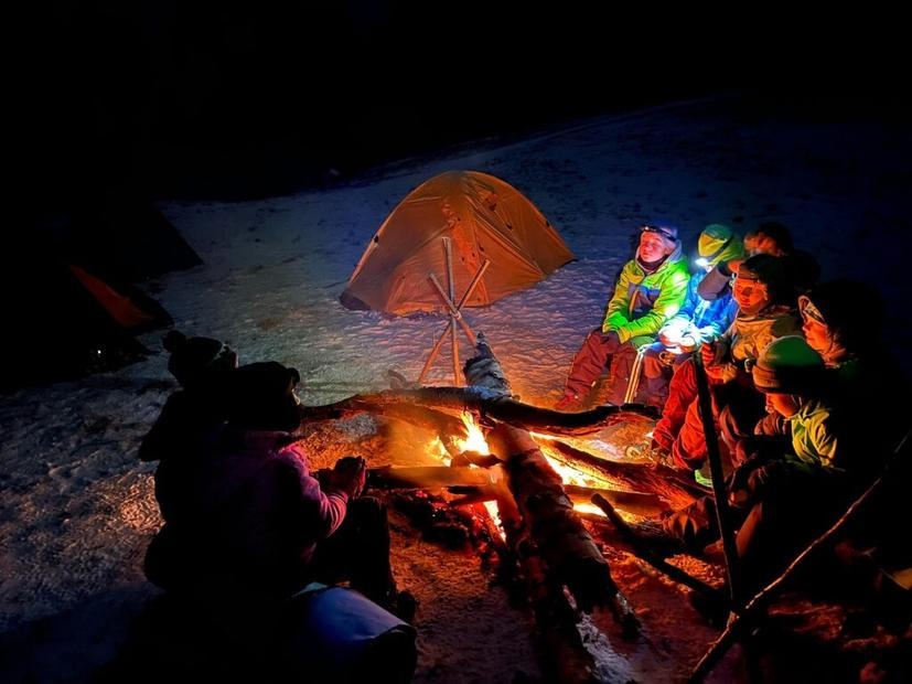 Těsně před osmou přicházím na místo. Oheň dohořívá. Tři stany a opodál z plachty postavené závětří, ve kterém spí Ilona a Tomáš. Manželé, oba učitelé v místní škole. S Ilonou se znám déle, absolvovali jsme už několik zimních expedic. Pro Tomáše je to první expediční nocování v mraze, stejně jako pro děti. Odhaduju, že devět dětí, z nichž některé mé křupání zmrzlým sněhem probudilo, by mohla být vlastně asi třetina celkového počtu dětí zdejší školy. Takže velká akce! Jenže dalšími nepřímými účastníky jsou rodiče, hlavně maminky, které tyhle dva dny prožívají plné napětí s telefonem v ruce. Vždyť nejmladší účastník ještě před pár měsíci chodil do školky. Pro maminky je to, byť doma v teple, asi mnohem náročnější než pro děti samotné.