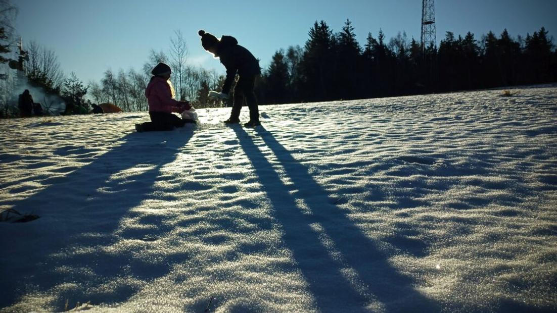Cestou se zvětšují vyhrnutné hromady sněhu, které po oblevě ještě zbyly. Na chráněných místech se postupně objevují velká a souvislá sněhová pole. Na jednom z nich bude tábořit devět dětí a s nimi dva učitelé. Místo noclehu se během dne hned několikrát změnilo. Děti putovaly zimní krajinou už od dopoledne, návrat je čeká druhý den navečer. Nakonec se rozhodly zůstat na jednom z nejvyšších kopců v blízkém okolí. „Zustavame u vysilace. Uz nechteji jit dolu. Pry vylezou na vychod slunce nad Hlubokou“, dostal jsem na messenger už v 16:10. Do háje… co tam tak dlouho s těmi dětmi v mraze budou dělat? Později se dozvídám, že největší starostí dětí prý bylo, aby nezapomněly tenisák a aby byl čas si s ním hrát. Žádná zima. Žádné rozhodování, jestli peří, nebo syntetika, či jak silné merino asi bude třeba. Prostě tenisák.