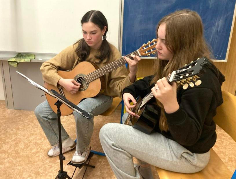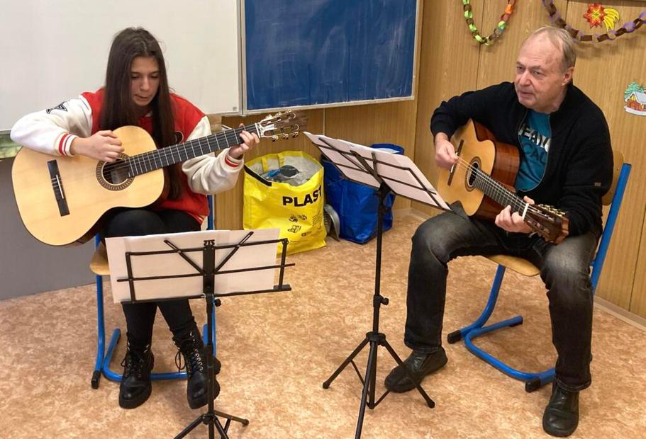 V přízemí budovy školy, kterou navštěvují žáci z druhého stupně, se z jedné třídy ozývá zvuk několika kytar, které doprovází i dívčí zpěv. Žáci tam mají pravidelnou hodinu kytary. A vsadili tady na skupinovou výuku. Děti se tak hru na kytaru i samotný rytmus učí díky vzájemnému sdílení rychleji. Navíc se mezi sebou napříč ročníky i více poznávají. „Tím, že hrajeme ve skupince, tak je tu uvolněnější atmosféra, což je pro ty děti lepší, než kdyby musely hrát někde samy. Snáze se tak zbaví studu,“ odůvodňuje volbu skupinových kroužků kytary jejich lektor Rostislav Vintr.
