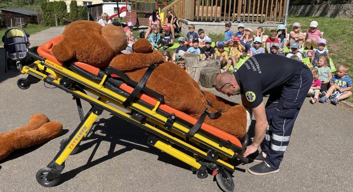 Počasí vyšlo, všichni mají dobrou náladu, jen Medvěd Brumla dnes opravdu nemá svůj den. Začalo to hned po příjezdu. Zničehonic prostě upadl a zůstal ležet na zemi. „Tak si představte, že takhle jdete s paní učitelkou po ulici a před vámi takhle někdo upadne a nehýbe se. Co uděláte?“ ptá se záchranář. Chvíli na ležícího medvěda kouká, rozmýšlí se a pak… „Tak ho asi takhle veeeelkým krokem překročíme a jdeme dál, ne?“ říká, zatímco překračuje ležící postavu. A děti křičí „néééé“. „Tak se ho třeba zeptáme, jestli nespí?“ ptá se Marek Hylebrant. „A co uděláme pak?“ zkouší školkáčky. „Zavoláme záchranku,“ ozve se z několik míst. „Kolik voláme?“ „Jedna! Pět! Pět!“ volají děti. „A co jim řeknete? Tady leží méďa, na shledanou?“ „Né! Musíte přijít do školky v Popovicích, leží tady méďa,“ volá chlapeček z první řady.