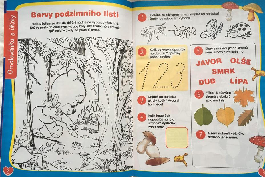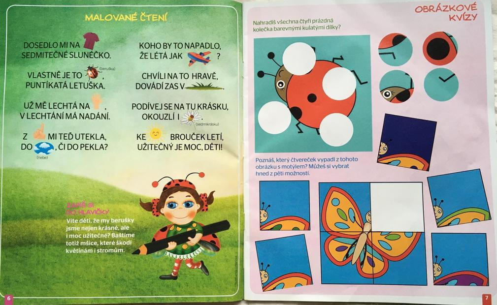 Úkoly zvládnou i mladší děti, součástí je i stránka slovíček v angličtině. Příjemné pro čtenáře je, že celým vydáním se line jeden motiv, například v květnu to byla beruška. Časopis obsahuje celou řadu jednoduchých cvičení na procvičování různých dovedností.