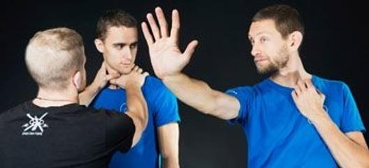 Než naši instruktoři tuto úvodní modelovou situaci zahrají, naučí nás postoj, do kterého se v případě blížícího se konfliktu postavíme. Nohy na šíři pánve, jedna před druhou – cílem je vytvořit co nejstabilnější postoj, váha rovnoměrně rozložena na obou chodidlech. Nohy jsou mírně pokrčené, je to bezpečnější, než kdybychom stáli s napnutýma nohama. Mírně natažené ruce máme před sebou, stojíme-li pravou nohou vpřed, máme vpředu skoro nataženou pravou ruku, levá ruka je pokrčena v lokti a je blíž k našemu obličeji, dál od útočníka.