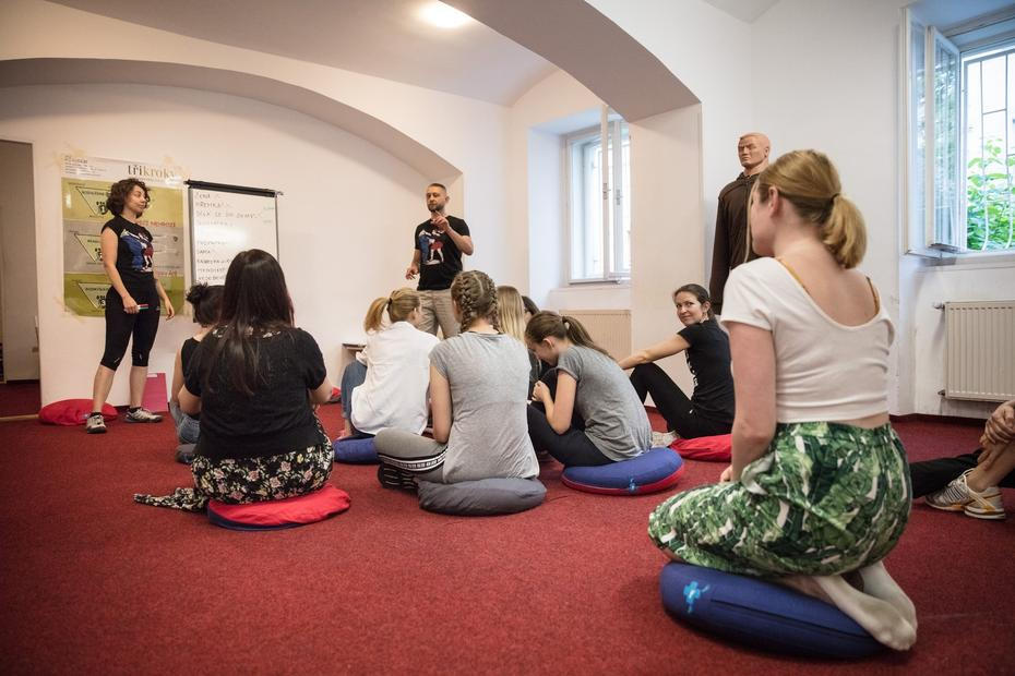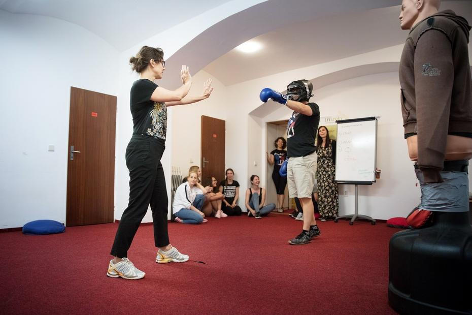Sešlo se nás deset dívek, žen, studentek a jedna máma se dvěma náctiletými dcerami. Víc než polovina přiznává předchozí zkušenost s přepadením, pro některé bylo motivací pro účast v kurzu aktuální řádění muže s nožem v pražském metru. Jsme v přízemí domu na pražské Letné, sedíme na koberci a s napětím očekáváme, co se na kurzu – za dvě hodiny – stihneme naučit. Hned na začátku si vyjmenováváme svá očekávání – chceme slyšet, jak se ubránit, jestli je lepší jít do konfliktu, nebo je lepší utéct. Máme si dát kabelku na zem? Předstírat, že telefonujeme? Anebo vyjednávat s agresorem?