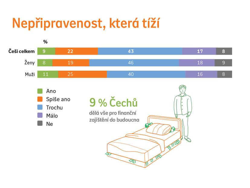 Přestože si Češi přejí žít dlouho a pro 71 procent z nich je největším strašákem nesoběstačnost, starost o sebe samé podceňují, a to téměř na všech frontách. Zatímco podle výzkumu je ze všech šesti parametrů nejdůležitější finanční příprava, Češi jí přikládají nejnižší váhu. Téměř 40 procent respondentů nemá žádné nebo jen minimální úspory.