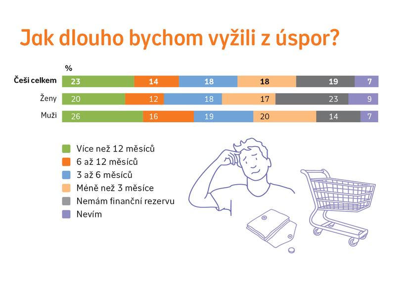Ženy jsou na tom navíc hůře než muži. Zcela zajištěných pro budoucnost se cítí jen 8 % žen a 20 % z nich v průzkumu uvedlo, že by při výpadku příjmů vyžily ze svých úspor déle než rok. Pro srovnání u mužů to bylo u stejných otázek 11 a 26 %.