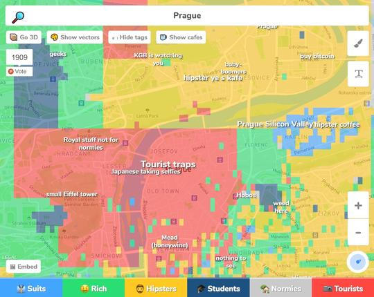 „Panovnické serepetičky“, „turistické pasti“, „Japonci se fotí“, „hipsteři na kafi“, „somráci“, „bitcoin“. Na Hoodmaps se za pět minut dozvíte o městě tolik jako ještě nedávno za půlroční pobyt.