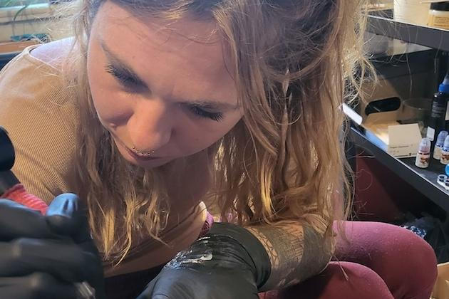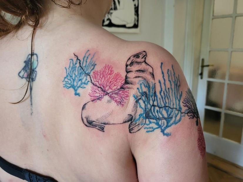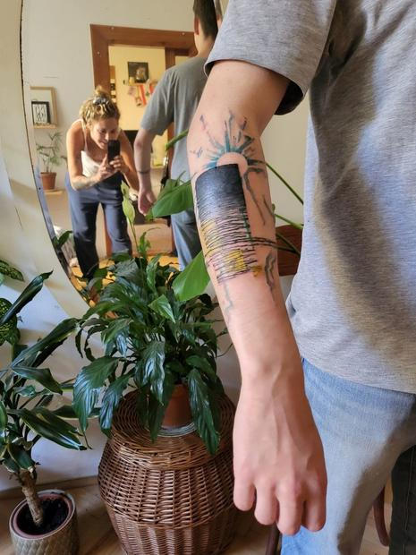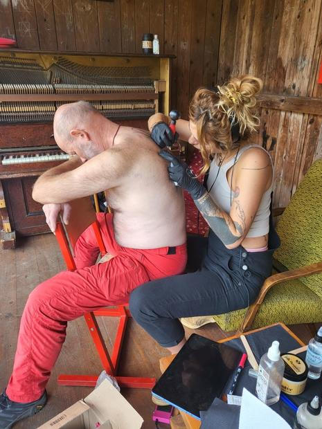 Tetovací klienty jsem zase úkolovala, ať sami zaznamenávají proces během session, a společně jsme zjistili, že je to super cesta, jak se zabavit a nesoustředit se tolik na bolest. Jednou večer se mi vybily všechny čelovky, které při tetování používám, a klient Sam mi celou dobu telefonem svítil. I jako baterka se véčko skvěle uplatnilo.