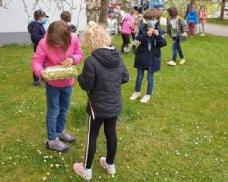 Jak skloubit dvě věci, které se zdají na první pohled jako neslučitelné, výuku a pohyb? To učitelka ukazuje na dalším úkolu. Děti dostanou proužek papíru s obrázky zvířat. Na stromě a na zemi jsou kolem nich kolíčkem připevněné lístky s větami jako „toto zvíře má dlouhý chobot”, „tento pták umí mluvit”, „toto zvíře hlídá dům”. U každé věty je číslo, které je třeba zapsat ke správnému zvířeti, každý do svého papíru. Děti vesele obíhají stanoviště a vyplňují „kvíz“. Pracují samostatně, někdo chce znát spolužákův názor. „Laura mi poradila špatně!” běží František za paní učitelkou.