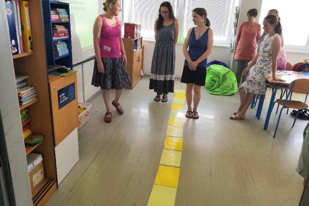 Učitelé mezitím tvoří hada, který se vydává po schodech do patra. V učebnách jsou pro ně připraveny semináře a dílny na nejrůznější témata, z nichž si každý den mohou vybírat. Geometrie pro 2. stupeň, Hodnocení, Autobus, Slovní úlohy, Krokování… Poslední jmenovanou vede hned v pondělí ráno Martina Josefová, učitelka ze ZŠ Ratibořická v Praze. Zatímco se asi desítka učitelek usazuje do lavic, začíná Martina svou prezentaci.