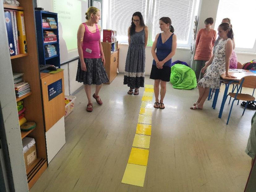 Brzy přichází na řadu i krokovadlo, na němž se střídají dvojice učitelek. „Zkusme si krokování s tleskáním,“ vybízí Martina a dodává: „Tleskat může buď ten, co krokuje, nebo zbytek třídy. Aspoň je nějak zaměstnáte.“ Během práce s pracovními listy sdílejí učitelé konkrétní situace ze třídy. Řeší, jak zadávat dětem pokyny, aby byly jednoznačné, nebo jak zabavit děti, které už při nástupu do školy zvládnou sčítat a odčítat. „Krokování slouží i k tomu, aby se děti naučily hledat různá řešení a dodržovat podmínky. Učí se i používat termíny jako právě tolik, nejméně, nejvýše,“ vysvětluje Martina Josefová výhody matematického prostředí.