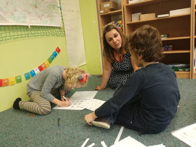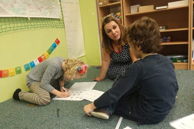 „Já nevím, co mám dělat,“ přichází druhačka Amálka. Dostává na vybranou z několika aktivit: může si dělat cvičení z učebnice, může si vyrábět násobilkovou knížku, kde si v hezké výtvarné podobě zaznamenává násobilku, nebo může dál pracovat s kostkou. Amálka si bere učebnici a sedá si s ní do lavice. „Máme pro děti připravených několik aktivit a žáci si můžou vybrat, čemu se budou věnovat. Mají týdenní a roční plán a chceme, aby sami přebírali iniciativu a zodpovědnost za plnění svých cílů. Druháci se to teprve učí, třeťákům už to jde celkem hezky,“ vysvětluje Kateřina.