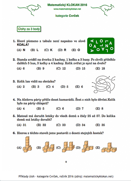 Do velké míry ano. Úlohy společně vybírají pořadatelé Klokana ze všech zapojených zemí ze stovek až tisíců navržených úloh na každoročním mezinárodním setkání, nicméně v rámci překladu si některé mohou přizpůsobit národním podmínkám. Okouzlující je pro mne pocit, že miliony žáků zasednou k řešení úloh téměř současně – obvykle ve třetím březnovém týdnu. V šesti věkových kategoriích řeší 18 až 30 úloh rozdělených do tří skupin podle obtížnosti. Nezodpovězená otázka se hodnotí 0 body, za chybnou odpověď se žákovi 1 bod odečítá, přičemž na začátku má každý přiděleno tolik bodů, kolik řeší úloh, aby se méně úspěšní řešitelé nedostávali do záporných hodnot. Doba, kterou mají žáci vymezenu na řešení úloh, se podle věku a náročnosti pohybuje od 45 do 75 minut, na řešení jedné úlohy mají tedy dvě a půl minuty.