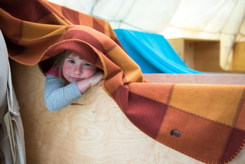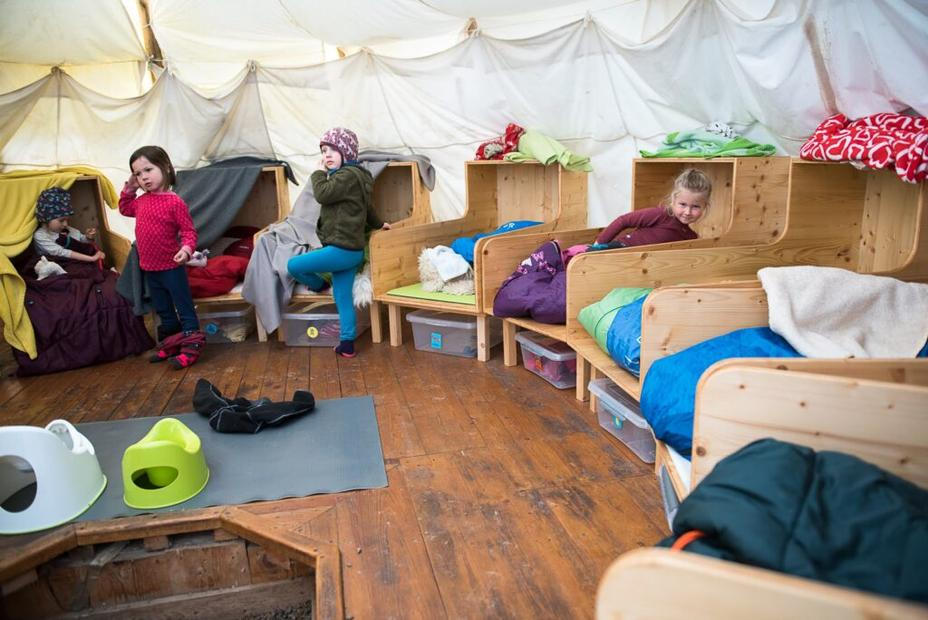 Liší se to jenom množstvím a druhem přikrývek. Jinak je všechno stejné – děti spí v nevytápěném venkovním přístřešku hned vedle maringotky, kde má každé svou postýlku s kožešinou a spacákem. V zimě tam jdou v tom oblečení, které nosí pod kombinézou, a mají teplé spacáky a přes ně deku nebo peřinku, v létě se někdy svléknou do spodního prádla a přikryjí jen chladivým lněným prostěradlem.