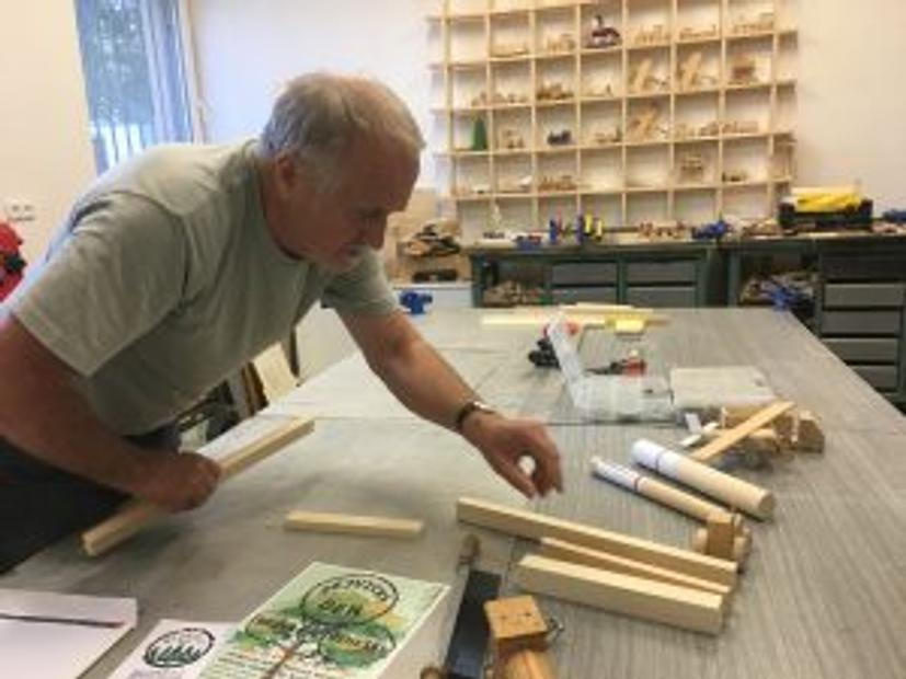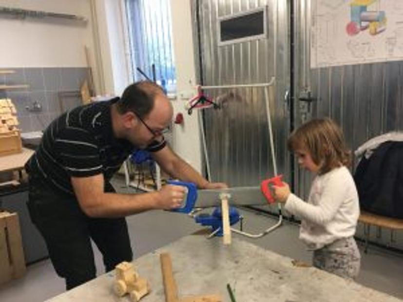 Předškoláci a rodiče tu společně vyrábějí jednoduché hračky. Důležité je to "společně". Stojí ob roh u pracovního stolu, mezi nimi svěrák, v ruce drží takzvanou dvougenerační pilku, vynález pana Píchy, a jednoduchými společnými řezy vyrábějí jednotlivé díly, které pak pospojují vruty. Vše je promyšlené tak, že dítě tomu může rozumět krok za krokem. „Nepoužíváme nic na elektriku,“ říká vedoucí kroužku. Na vrtání tu mají ruční vrtačky s kuželovým převodem, které vypadají tak trochu jako domácí šlehač.