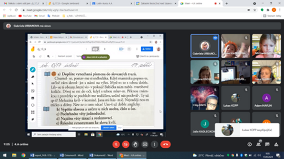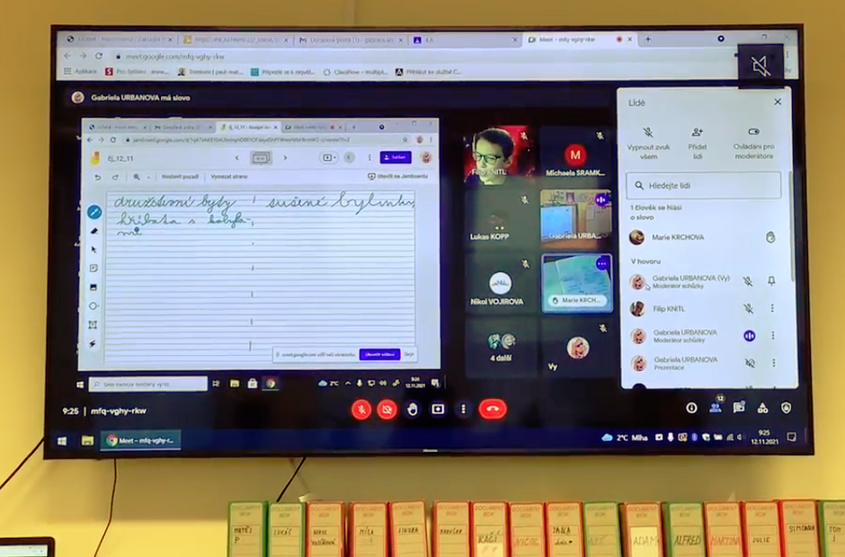 První hodinu je čeština, druhou matematika. Gabriela Urbanová se napřed se všemi přivítá, ověří si, že ji všichni slyší a vnímají, a pak už začíná hodina. Nejdřív si děti osvěží vyjmenovaná slova po P, pak zapíná interaktivní tabuli a na ní otvírá svou dnešní přípravu. Používá aplikaci Jamboard, která umožňuje snadné vkládání a úpravy vloženého textu a obrázků. Přítomné děti chodí I a Y doplňovat k tabuli, děti, které jsou doma, jim správnost řešení kontrolují. Na další cvičení se role vyměňují, doplňují nepřítomní žáci a kontrolují jejich spolužáci. Učitelka na základní škole ve Zruči nad Sázavou děti povzbuzuje, oceňuje – i za to, jak umějí psát na tabuli, i za to, jak zvládají práci s Jamboardem.