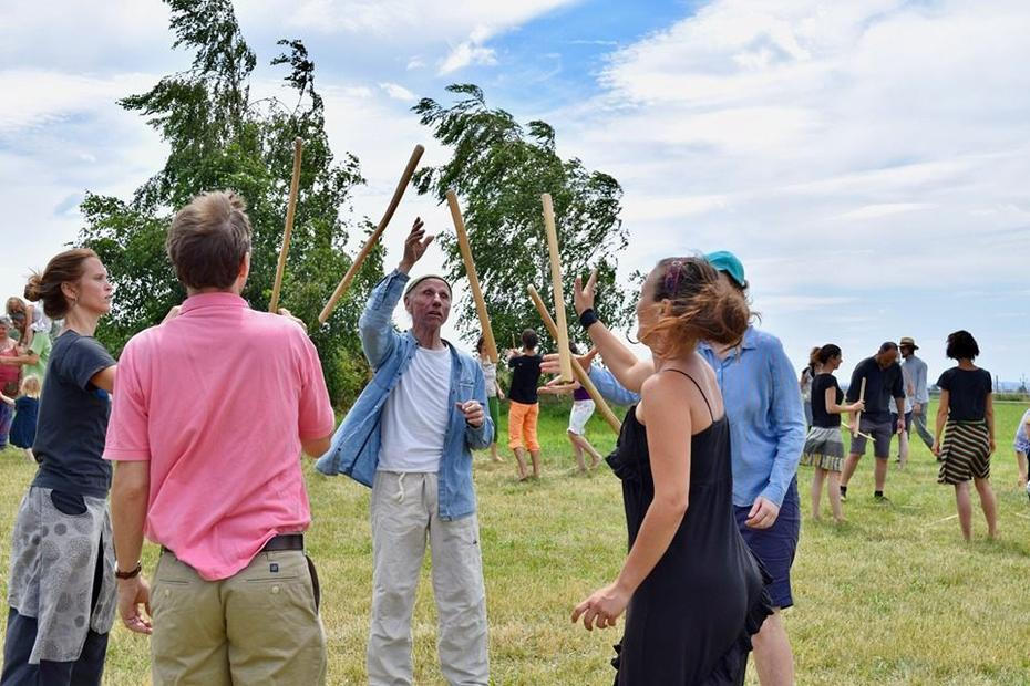 Další oblíbenou hrou - hraje se venku na louce - je házení paličkami v kruhu. Od jednoho chytáš, druhému házíš, a to dělá společně kruh o pěti lidech. Když je vše, jak má být, nastane plynulý pohyb, jemný proud interakce, paličky se nesrážejí ani nepadají. Ideální skupinová dynamika. Když padají nebo se srážejí, taky je co zkoumat. Podle Švéda Pära Ahlboma, který je otcem zakladatelem tohoto směru-nesměru a přijel na tento seminář, i když mu je už osmdesát pět let, je dokonce neúspěch to nejlepší: „Když to člověku hned jde, nenastane ten moment, ze kterého se učíme,“ říká.