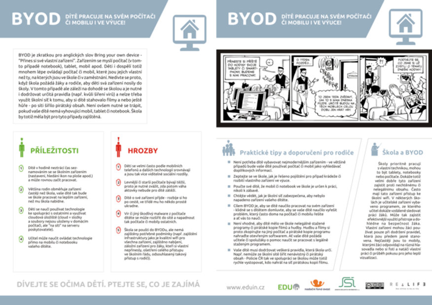 Svůj mobil nebo tablet mají všichni po ruce a není nic snadnějšího než ho vytáhnout a googlovat. Patří to k našemu životu, můžeme to vytlačit ze školy? Taky je to rychlé, nemusí se rozdávat školní zařízení či dokonce přecházet do speciální učebny, odpadá spousta zdržování. A nejde samozřejmě jen o googlování, mobil ve výuce se dá dnes využít všemožně, třeba na vytváření videí... Co když ale nějaké dítě chytrý mobil nemá? Škola musí být připravená na náhradní řešení, ale již samotným principem BYOD se žák bez chytrého telefonu stává zvláštním. Škola podporující BYOD tak říká, že vlastnit chytrý telefon a tablet i v dětském věku je standard, nebo ne?
