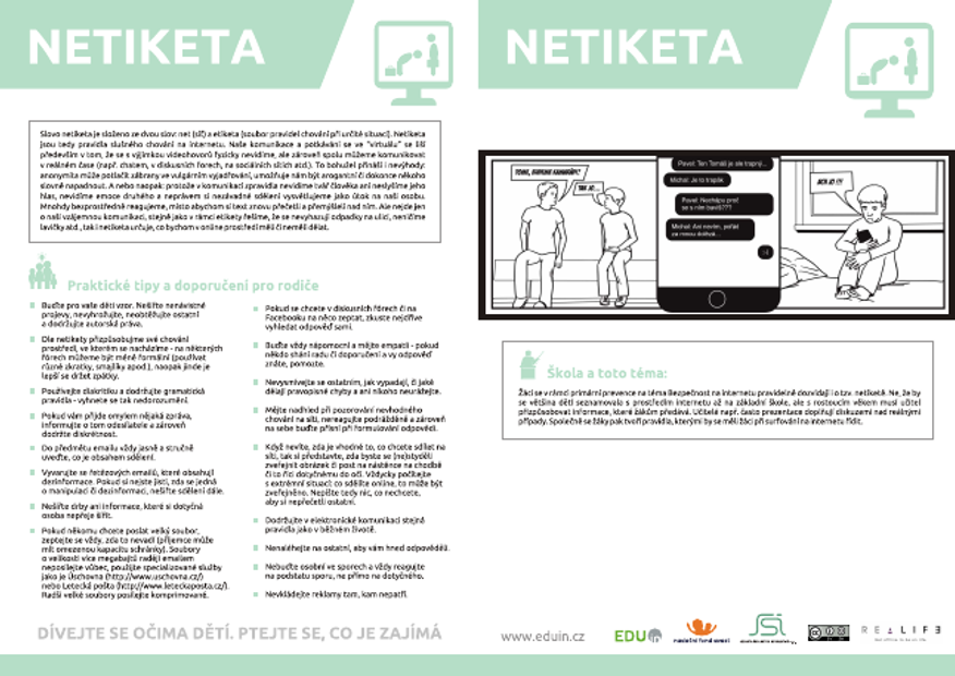 Tak jako se všichni shodneme na tom, že by se neměly odhazovat odpadky na ulici nebo ničit v parku lavičky, má podobná nepsaná pravidla i internet. Říká se tomu netiketa a při pročítání internetových diskusí se mnohdy nelze ubránit pocitu, že by měla patřit mezi povinné vzdělání. Jelikož to tak zatím není, učte ji své děti a hlavně – buďte pro ně vzorem.