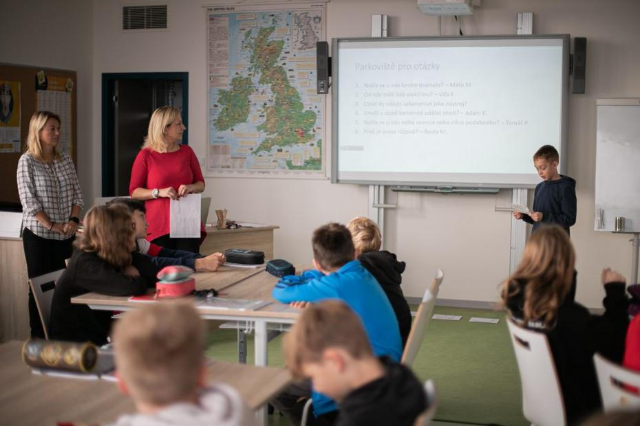 Tak to probíhá i během hodiny dějepisu v šesté třídě. Už o přestávce jsou ve třídě dvě učitelky, které společně dolaďují poslední detaily hodiny dějepisu s tématem Věstonice. Žáci sedí v upravené třídě po čtyřech, mezi nimi ukrajinští spolužáci, kteří se mohou v rámci skupin s ostatními dětmi radit. Hodina začíná tzv. „parkovištěm pro otázky“, během kterého žáci prezentují připravené odpovědi na dotazy, které vyvstaly z minulé hodiny. A na jejich vypracování reagují učitelka dějepisu Pavla Nawratová a učitelka přírodopisu Renata Klimešová.
