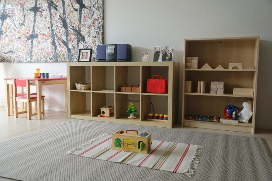 Karenin roční chlapeček byl okamžitě nadšený z koutku, který pro něj Simone připravila. Na každé polici tu na něj čeká jedna jednoduchá batolecí hračka, na níž jeho malé ruce snadno dosáhnou. Čtyřletou dceru zase potěšilo, že má náhle volný přístup k nůžkám a lepidlu; navíc na tácu, který snadno zachytí všechen nepořádek a může se klidně zamazat a ulepit.